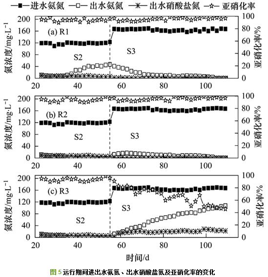 實驗分為S1、S2、S3這3個階段:S1階段為亞硝化階段, 采用低碳氮比的人工配水啟動亞硝化; S2階段為亞硝化污泥顆粒化階段, 通過在R2、R3反應器中分別添加20%的好氧顆粒污泥、20%除磷顆粒污泥以期加快顆粒化進程; S3階段為強化顆粒化階段, 通過增加進水中的COD負荷和氨氮負荷, 促使亞硝化顆粒增大和提高系統的亞硝化性能.