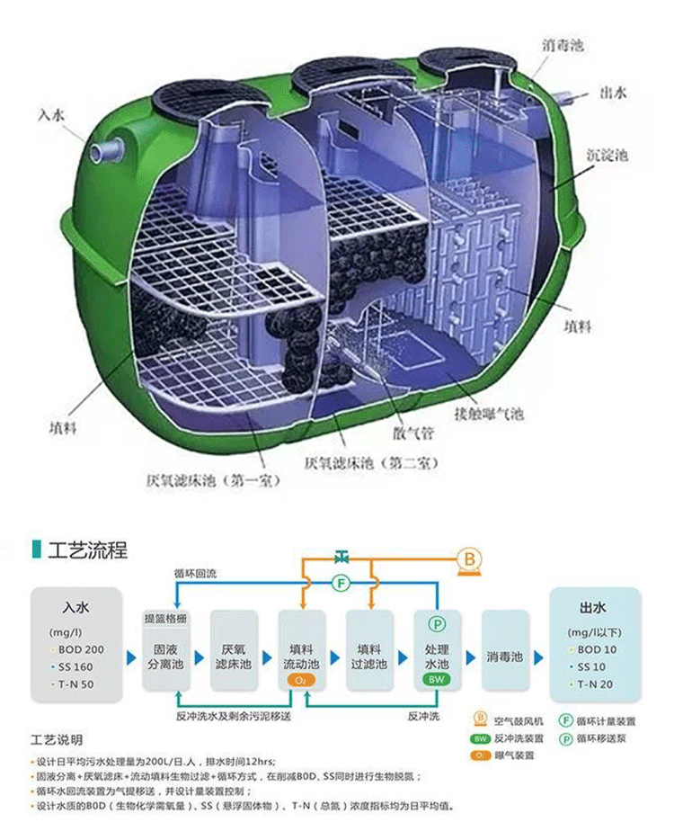 3 四川凈化槽生化池采用生物接觸氧化法,其填料的體積負(fù)荷比較低,微生物處于自身氧化階段,產(chǎn)泥量少,僅需三個(gè)月(90天)以上排一次泥(用糞車抽吸或脫水成泥餅外運(yùn))。