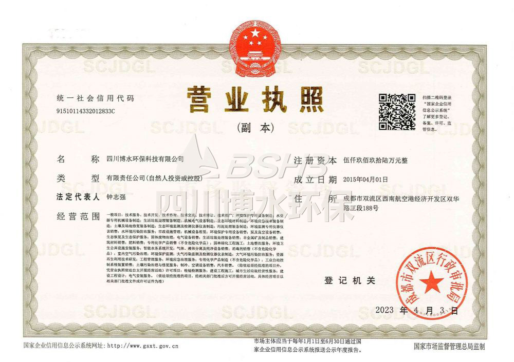 博水環保已成為四川省高新技術企業、四川省環保產業協會理事單位、中國環保產業協會會員,前后獲得70多項國家技術專利及軟件著作權、水污染治理甲級、環保設備制造甲級、污水處理設施運維二級、市政工程總承包三級、環保工程三級、機電安裝工程三級等相關資質;通過了ISO9001/2015質量/環境/健康、質量服務AAA示范單位等體系認證;